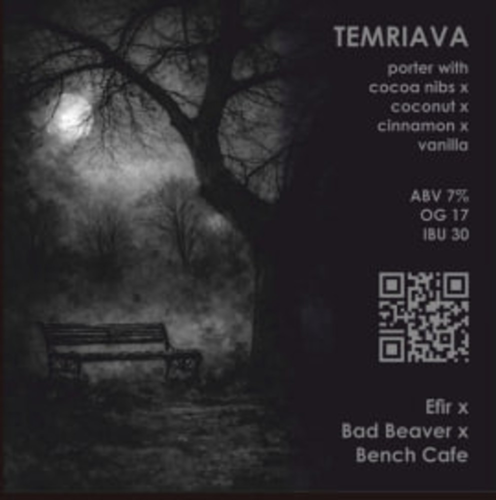 “TEMRIAVA” - ПРИЄМНИЙ ШОКОЛАДНИЙ ТА СУХИЙ В СМАКУ PORTER МІЦНІСТЮ ПІД 7%, ЯКИЙ МИ ЗБАГАТИЛИ ВАШИМИ УЛЮБЛЕНИМИ СПЕЦІЯМИ: КАКАО БОБАМИ, КОКОСОМ, ВАНІЛЛЮ ТА КОРИЦЕЮ. РЕЗУЛЬТАТ СПІЛЬНОЇ РОБОТИ EFIR X BENCH CAFE X BED BEAVER